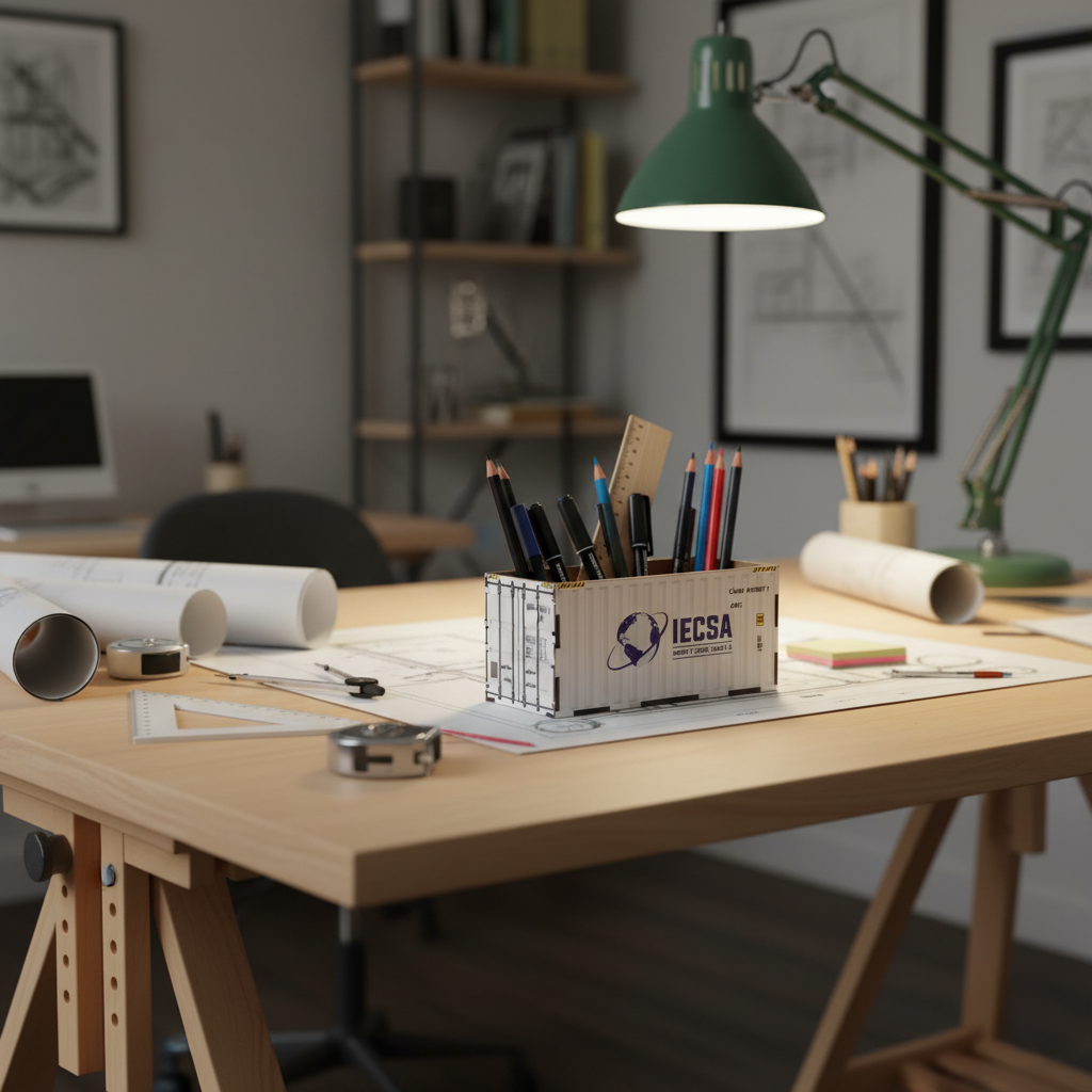 Porta lápices con forma de contenedor, personalizable y temático.